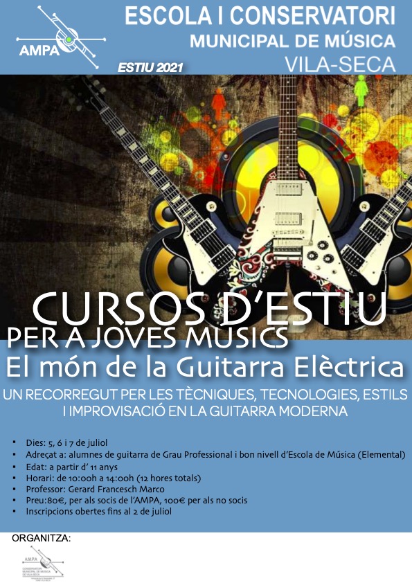 L'AMPA organitza un any més els Cursos d'Estiu per a Joves Músics. Trobareu informació detallada sobre el curs "EL MÓN DE LA GUITARRA ELÈCTRICA" clicant sobre el text.
