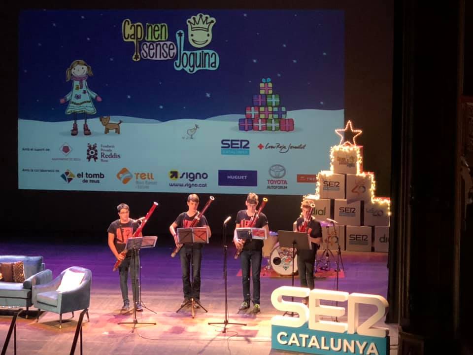 El mes de gener va tenir lloc la gala del “Cap nen i nena sense joguina” al Teatre Fortuny de Reus on va participar el “Quartet de fagots 1/2 2/3”. Excel·lent intervenció del quartet, que va representar al conservatori en aquesta gran iniciativa que amb tots els actes organitzats, inclòs el nostre concert de Nadal, va recollir 2.366 joguines. Molt contents de haver-hi contribuït!