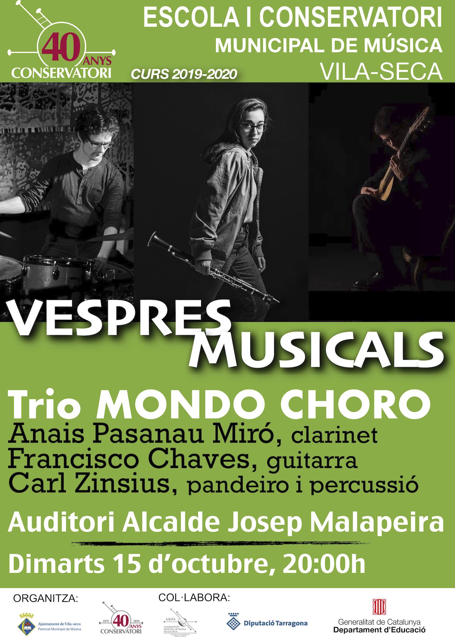 Tornen els "Vespres Musicals" de la mà de MONDO CHORO, un trio molt interessant amb una proposta sobre música del Brasil. Us esperem el proper dimarts 15 d'octubre a les 20h a l'Auditori Alcalde Josep Malapeira. Entrada lliure.