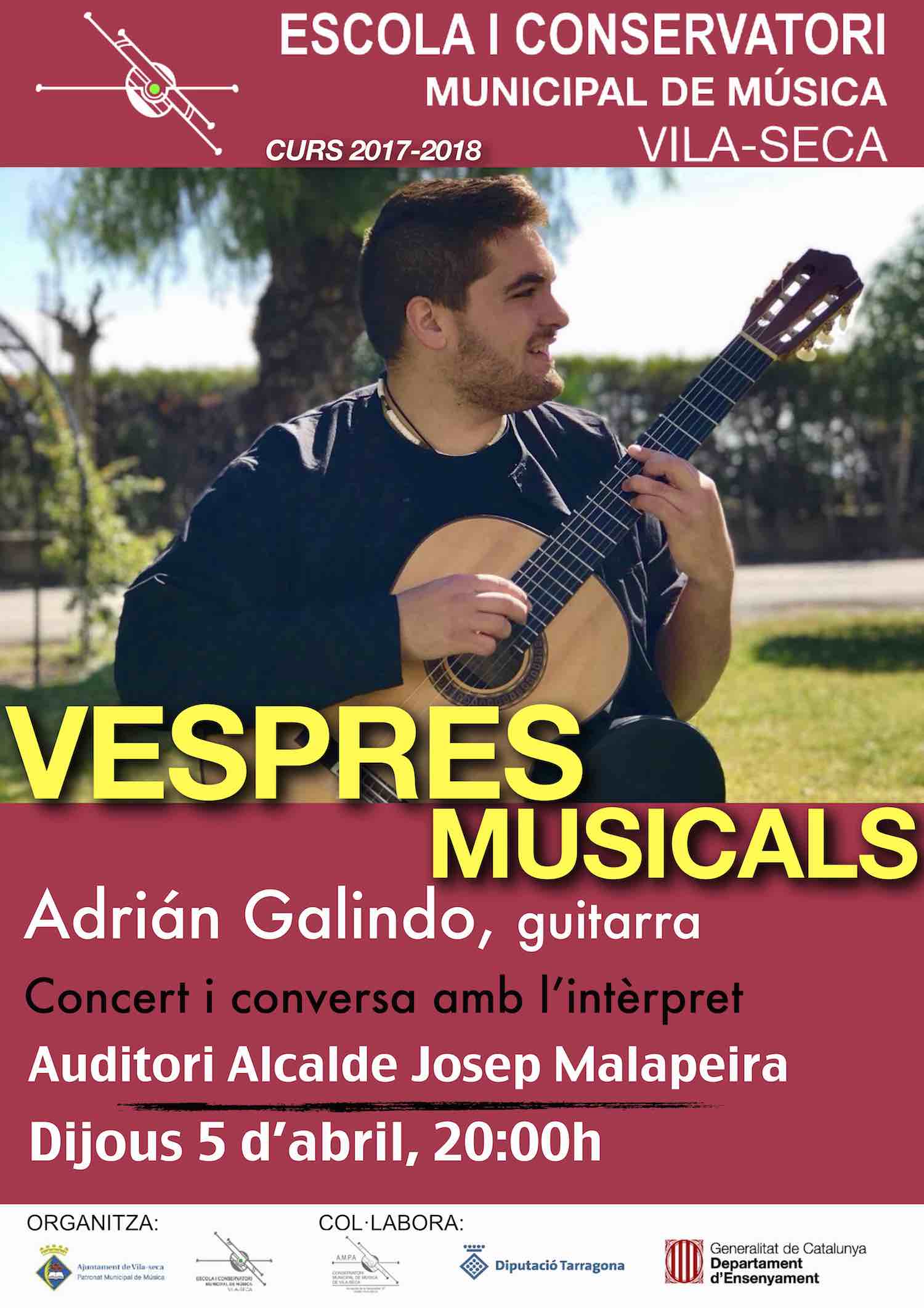 Aquest proper dijous 5 d'abril tindrà lloc el primer concert del cicle "Vespres Musicals". Cicle en el que que cada any convidem a exalumnes del centre que estan cursant el Grau Superior. En aquesta ocasió comptarem amb la participació del guitarrista Adrián Galindo. Us hi esperem!!!