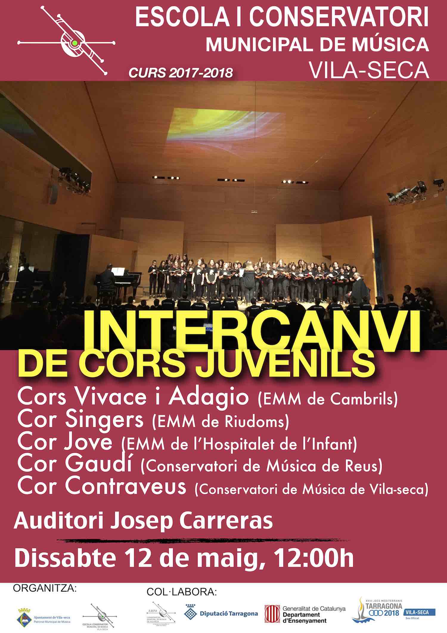 Després d'haver participat al primer dels intercanvis celebrat a Cambrils, el proper dissabte 12 de maig a les 12:00h tindrà lloc l'Intercanvi de Cors Juvenils al conservatori de Vila-seca, on participaran els Cors Vivace i Adagio de l'Escola Municipal de Música de Cambrils, el Cor Gaudí del Conservatori de Música de Reus, el Cor Contraveus del Conservatori de Música de Vila-seca, el Cor Singers de l'Escola Municipal de Música de Riudoms i el Cor Jove de l'Escola Municipal de Música de l'Hospitalet de l'Infant.