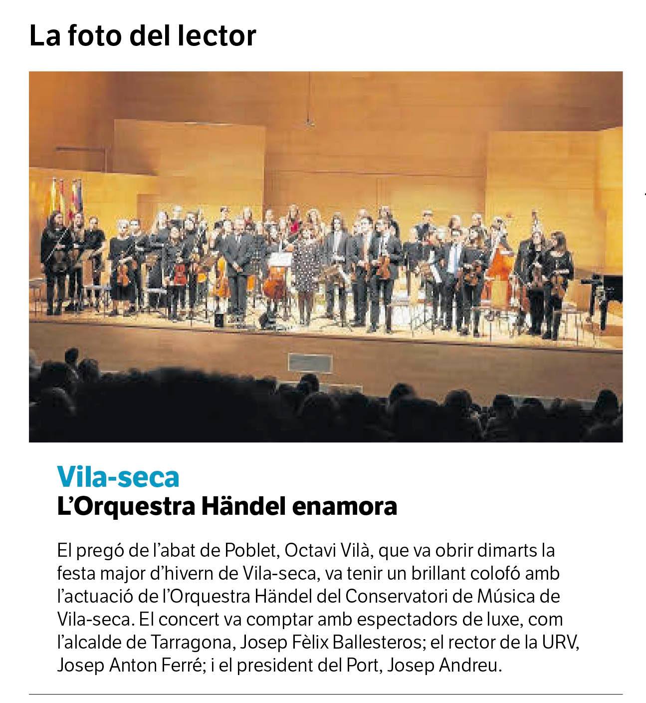 Compartim la notícia del Diari de Tarragona sobre la participació de l'Orquestra Händel al Pregó de Festa Major de Sant Antoni.